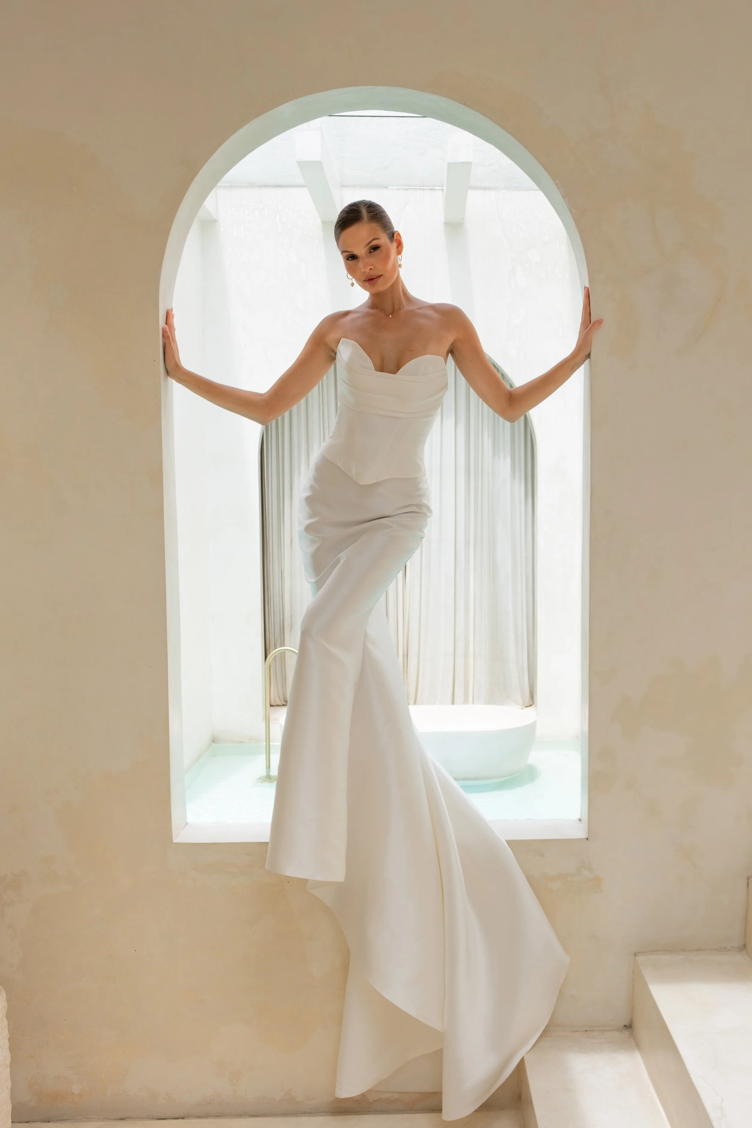 Va va VOOM! Tove is the perfect style for a bride who wants an elegant style, but isn’t afraid to make a bold statement! Crafted from that structured Mikado fabric I was telling you about, this two piece style (yes, you read that right) will have you feeling snatched and sculpted on your wedding day.
