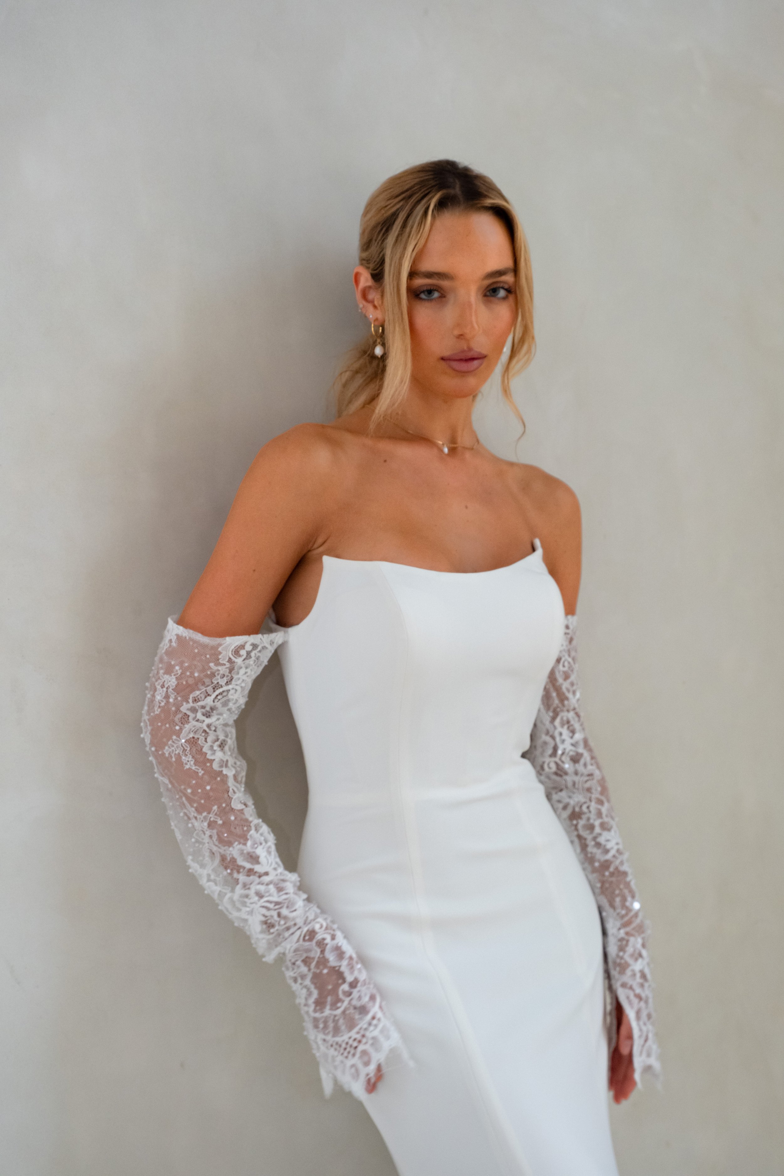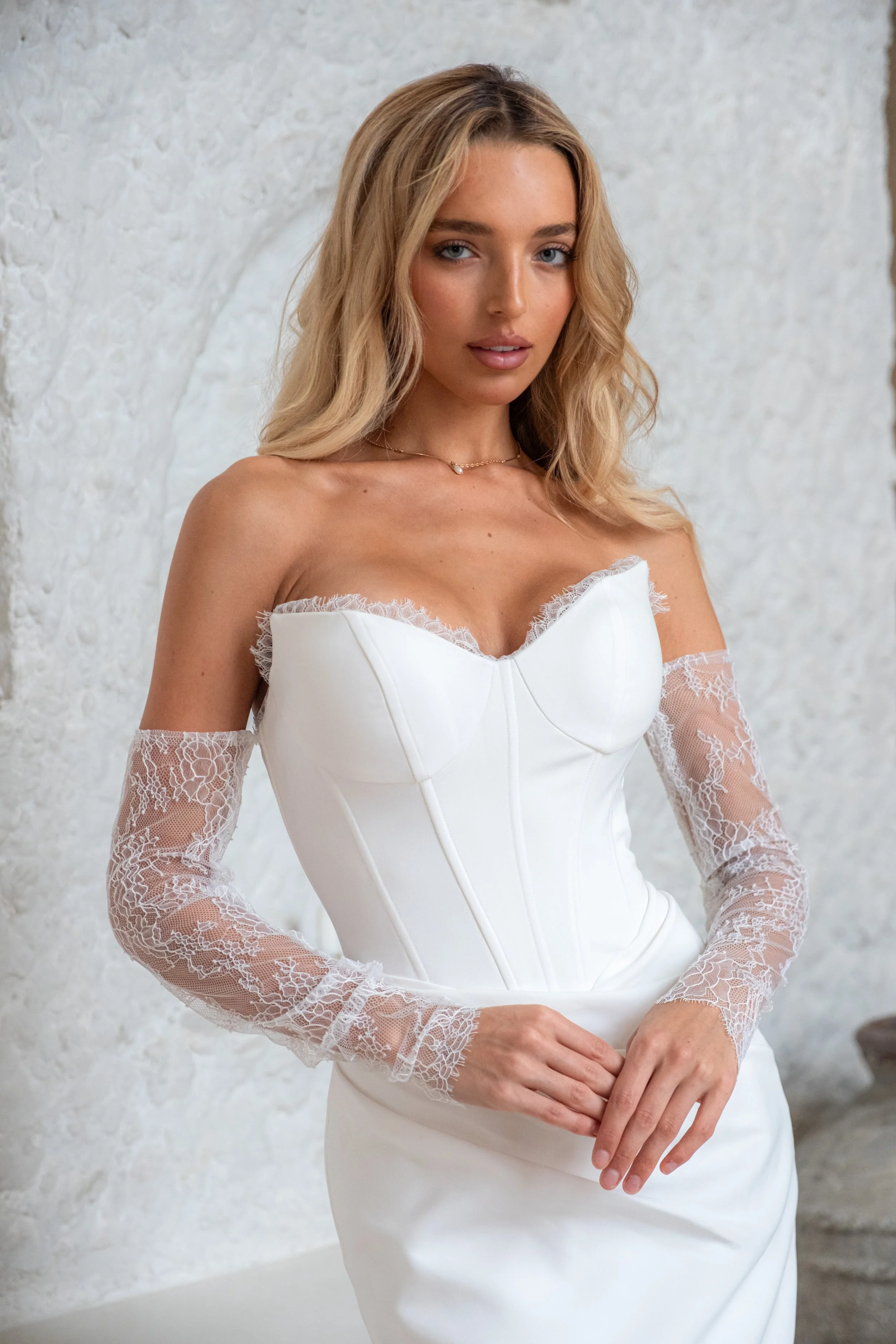 If you looked up tasteful sexiness in the dictionary, Tegan’s picture would be there. The deep sweetheart neckline and exposed boning in the bodice offer a pinch of sexy, while the delicate lace sleeves, ruched wrap skirt and crepe fabric create a tasteful and elegant look. Wait until you feel the structure of this bodice, you will feel nothing short of SNATCHED as you walk down the aisle, wowing each and every guest with every step.